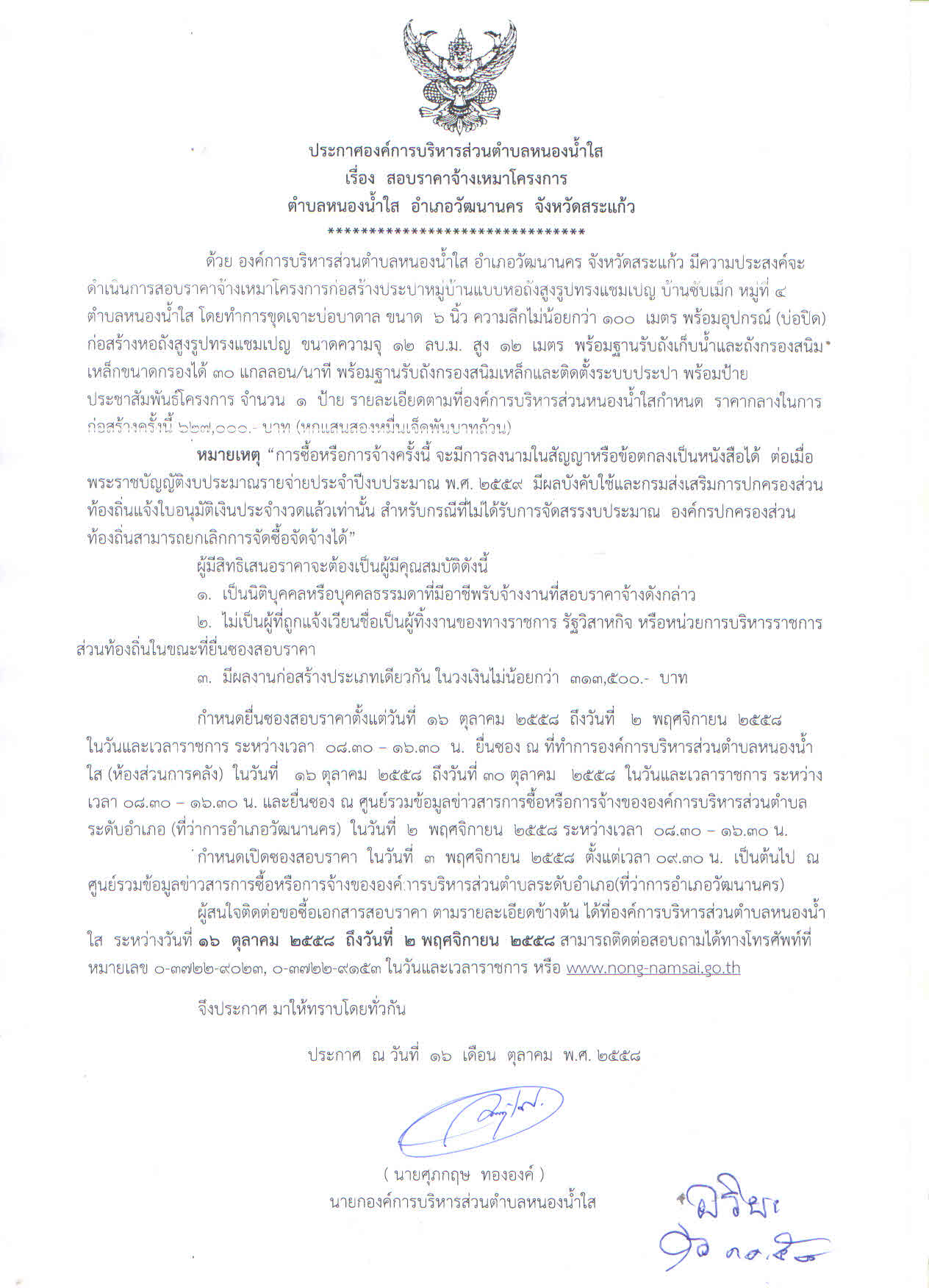 ประกาศผู้ชนะการเสนอราคา จ้างโครงการก่อสร้างถนนคอนกรีตเสริมเหล็ตหมู่ที่ 6 บ้านเนินสะอาด ตำบลหนองน้ำใส โดยเฉพาะเจาะจง |