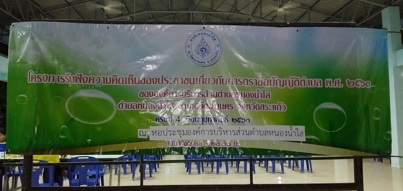 วันที่ 11 กุมภาพันธ์ 2563 เวลา 16.30 - 20.30 น. นายบัณฑิต ผลาหาญ ตำแหน่งผู้อำนวยการกองช่าง รักษาราชการแทนปลัดองค์การบริหารส่วนตำบลหนองน้ำใส และพนักงานเจ้าหน้าที่ องค์การบริหารส่วนตำบลหนองน้ำใส ร่วมรับฟังความคิดเห็นของประชาชนเกี่ยวกับการตราข้อบัญญัติตำบล ประจำปี งบประมาณ 2563 ประชากร ของหมู่ที่ 4 บ้านซับเม็ก ประชากร ของหมู่ที่ 5 บ้านซับนกแก้ว และ ประชากรหมู่ที่ 7 บ้านซับน้ำบุ้น โดยลงพื้นที่ร่วมรับฟัง หอประชุมองค์การบริหารส่วนตำบลหนองน้ำใส หมู่ที่ 4 บ้านซับเม็ก ตำบลหนองน้ำใส อำเภอวัฒนานคร จังหวัดสระแก้ว |