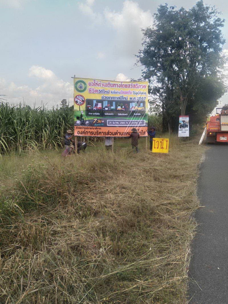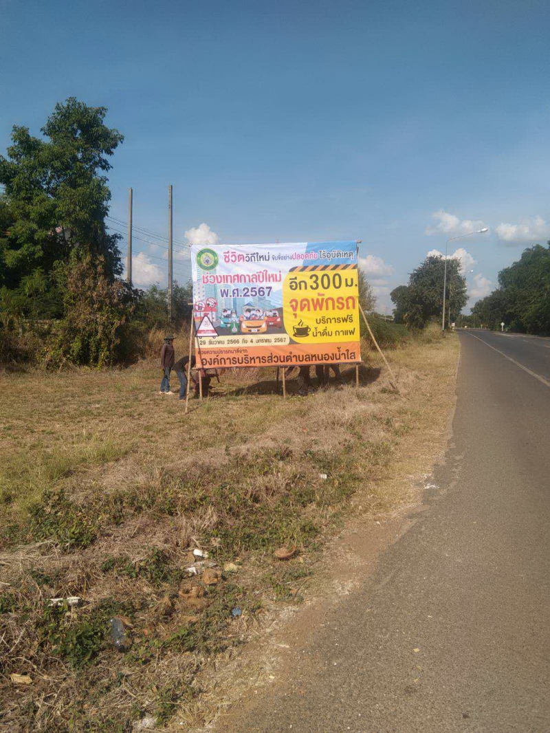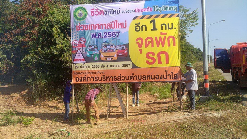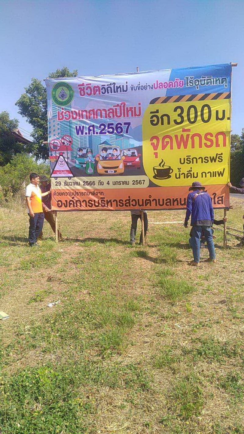 ได้มอบหมายให้ เจ้าหน้าที่ลงพื้นที่ ติดตั้งป้ายชีวิตถิวีใหม่ ขับขี่ปลอดภัย ไร้อุบัติเหตุ ช่วงเทศกาลปีใหม่ พ.ศ. 2567 บริเวณข้างทางถนนทางโค้ง ทางแยก เพื่อแจ้งให้ใช้รถสัญจรผ่านเส้นทาง ได้ขับขี่รถด้วยความระวัง