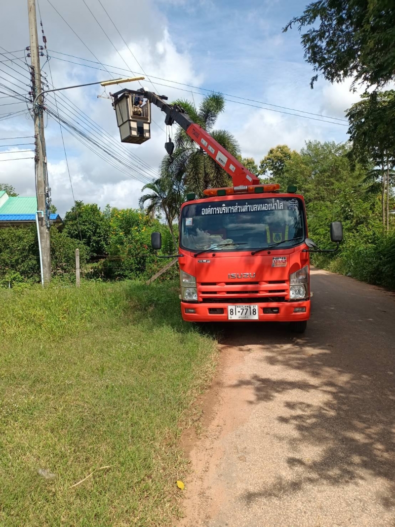 นายเทียม ทององค์ นายกองค์การบริหารส่วนตำบลหนองน้ำใส มอบหมายให้ นายปรีชา ถาวรสุข ผู้ช่วยนายช่างโยธา และนายณัฐวุฒ ณงค์เพ็ชร คนงาน ออกดำเนินการซ่อมไฟรายทาง
