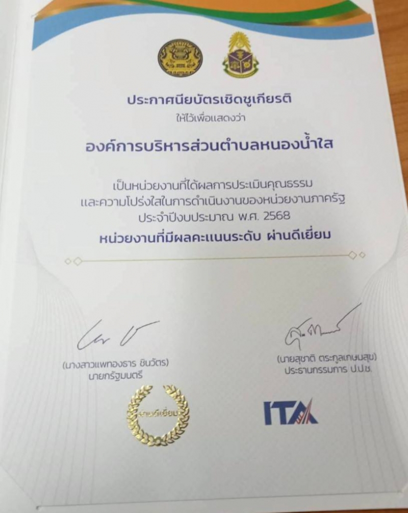 นายปิยวัฒน์ สาโท ปลัดองค์การบริหารส่วนตำบลหนองน้ำใส ปฏิบัติหน้าที่นายกองค์การบริหารส่วนตำบลหนองน้ำใส ได้มอบหมายให้ นางสาวพัชรีญา เพ็ชรโพธิ์ หัวหน้าสำนักปลัด พร้อมด้วย นางนุชรี พรมทิพย์ นักพัฒนาชุมชน และ นางสาวกัญวัฒน์ ชะนะชัย นักจัดการงานทั่วไปปฏิบัติการ ร่วมกิจกรรม การรับเกียรติบัตรการประเมินคุณธรรมและความโปร่งใสในการดำเนินงานของหน่วยงานภาครัฐ (ITA) องค์กรปกครองส่วนท้องถิ่นที่ผลคะแนนการประเมินระดับผ่านดีเยี่ยม ประจำปีงบประมาณ พ.ศ. 2568